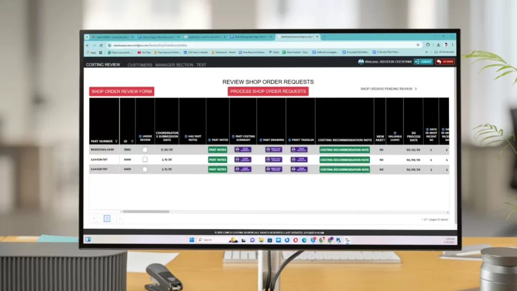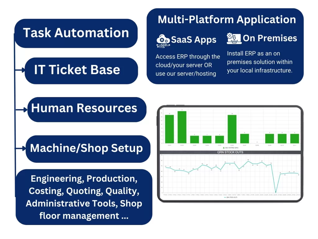 This ERP includes custom modules such as Task Management, Human Resources, Production, Purchasing, Sales, Engineering, Costing, Quality, Quoting, Machine Setup Sheets, IT Support, Tool Crib, Production Time Sheet Management, Phantom Scrap control, etc.